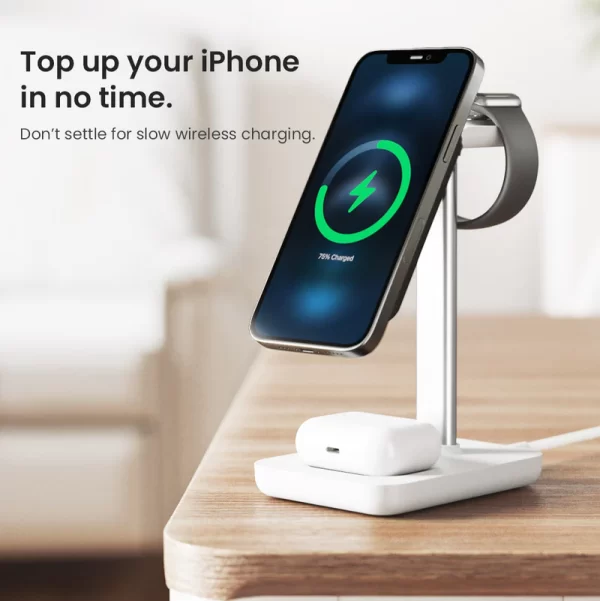 - Charges all 3 devices (iPhone 16/15/14/13/12; Apple Watch Series: 3-10, SE & Ultra 1/2; AirPods – Wireless Charging Models)at once- no extra cables required