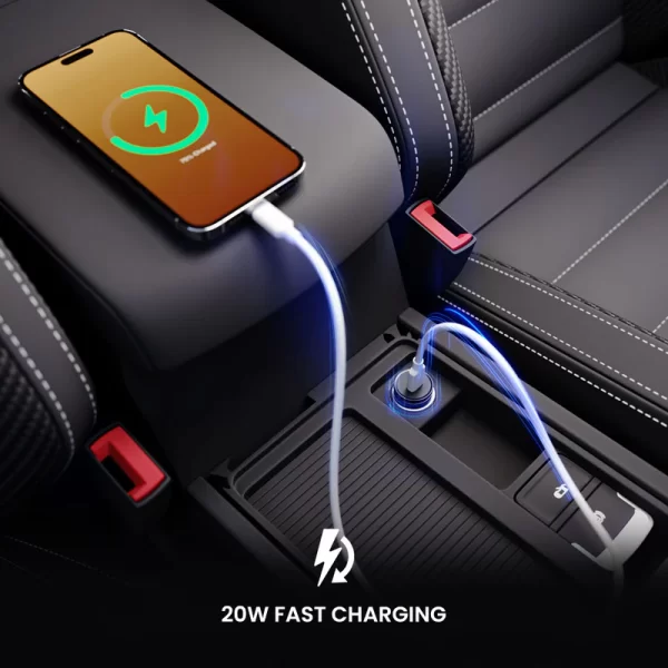 - The 20W car Charger boasts a compact design. It seamlessly fits into the car’s power socket.